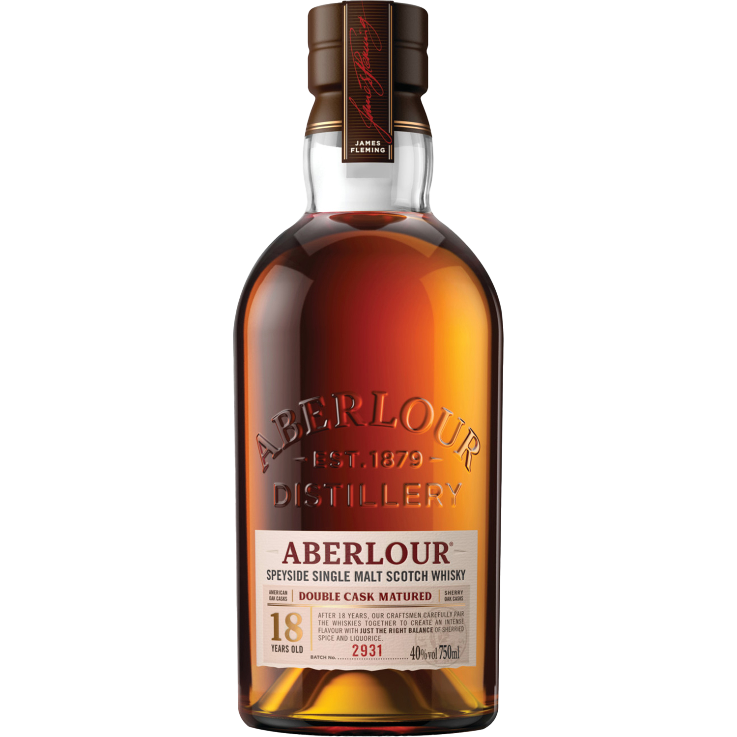 Spicy and luxurious, Aberlour 18 Year Old single malt Scotch whisky is crafted along the River Spey in the Aberlour distillery. A deeper Sherry influence adds more spiciness and a licorice tang. Greater age adds body and develops the distinctive fruitiness to a rich raisin character. Double Cask, Our makers mature the whisky in two different types of casks: American Oak casks bringing notes of vanilla and toffee, and Oloroso Sherry casks imparting spice and richness. During the years of maturation, the whiskies subtly absorb the casks complexity, adding intricate layers and refined depth. When the time comes, our craftsmen skilfully bring the single malts from both casks together, an art requiring dedication and years of expertise to achieve just the right balance of depth and flavour. The craft of double cask maturation. Double cask matured for a minimum of 18 years, this well-balanced single malt perfectly combines a rich and intense character, with layered notes of juicy sultanas and toffee imparted by the Oloroso and Pedro Ximénez casks. A complex and deeply sherried whisky, with a long and sweet finish.Enjoy Responsibly.